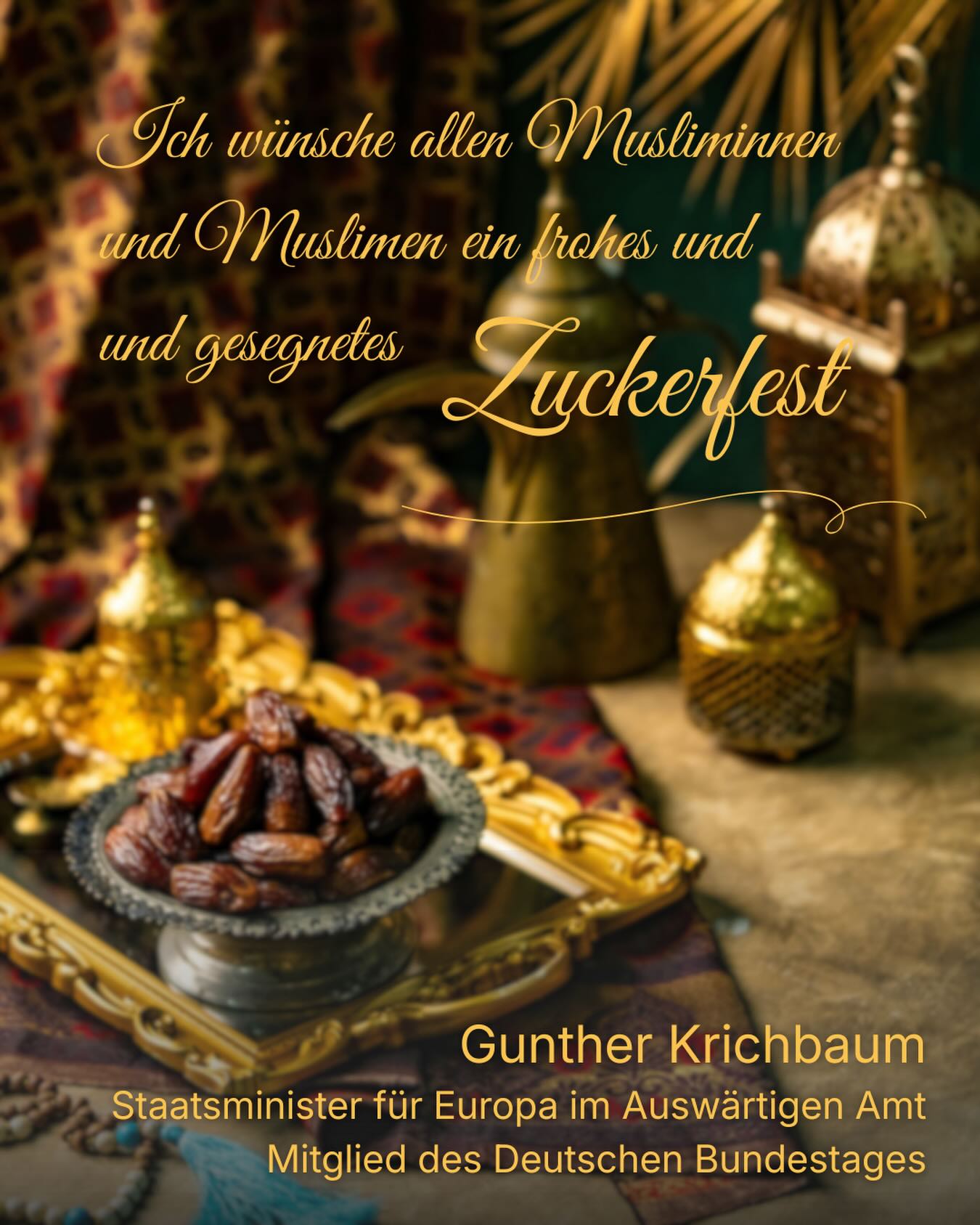 Ich wünsche allen Musliminnen und Muslimen ein frohes und gesegnetes Zuckerfest! 🌙✨ Gestern Abend ging der Fastenmonat Ramadan zu Ende ? ein Monat, der mit Besinnung, Familie und besonderen kulinarischen Traditionen verbunden ist. Ab heute werden die neu gekauften Kleider getragen und die vielen zu Hause gebackenen Kekse gegessen. 👗👕🍪 Ich wünsche euch ein wundervolles und frohes Fest. Eid Mubarak! #EidMubarak #Zuckerfest #Ramadan